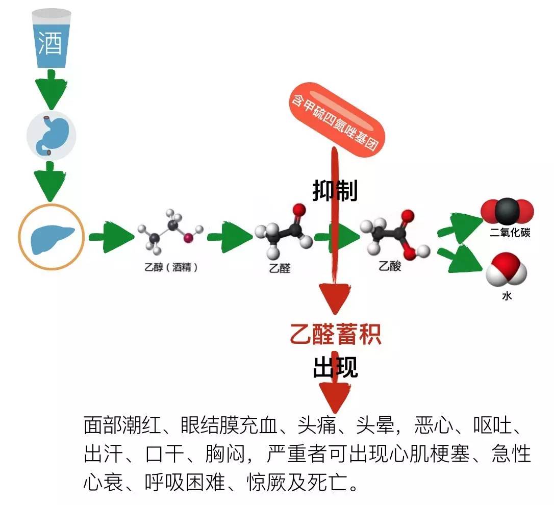 說(shuō)到吃藥+喝酒要人命,大家比較熟悉的是使用************后喝酒要人命的藥源性雙硫侖樣反應(yīng)!當(dāng)然不是所有的************都會(huì)引起藥源性雙硫侖樣反應(yīng)!一般都是含有甲硫四氮唑基團(tuán)******才會(huì)引起!因其抑制肝臟中的乙醛脫氫酶,導(dǎo)致乙醇的中間代謝產(chǎn)物——乙醛代謝受阻,使血液中乙醛濃度增加而發(fā)生雙硫侖樣反應(yīng)!